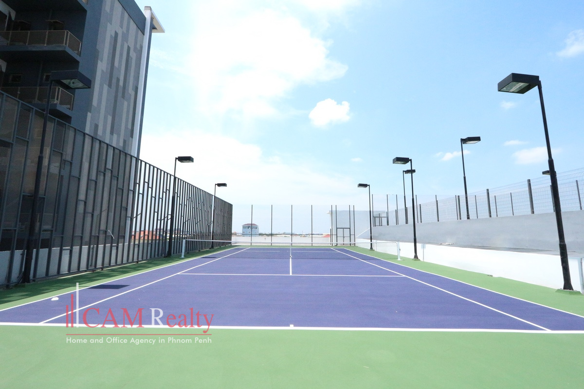 Modern style 3 bedrooms apartment for rent along street 2004, Sangkat Teok Thlar, Phnom Penh. This nice apartment locates 8 minutes drive from Phnom Penh International Airport at the east and 4 minutes drive from North Bridge international school. The complex comes with 3 swimming pool and one 50 meters length, big open jacuzzi next to the pool, fitness center, tennis court & basketball outdoor court.