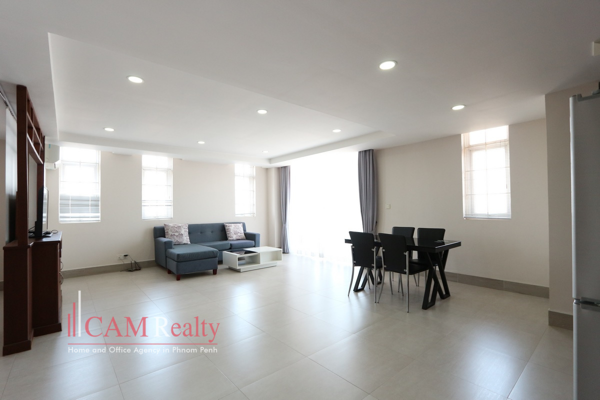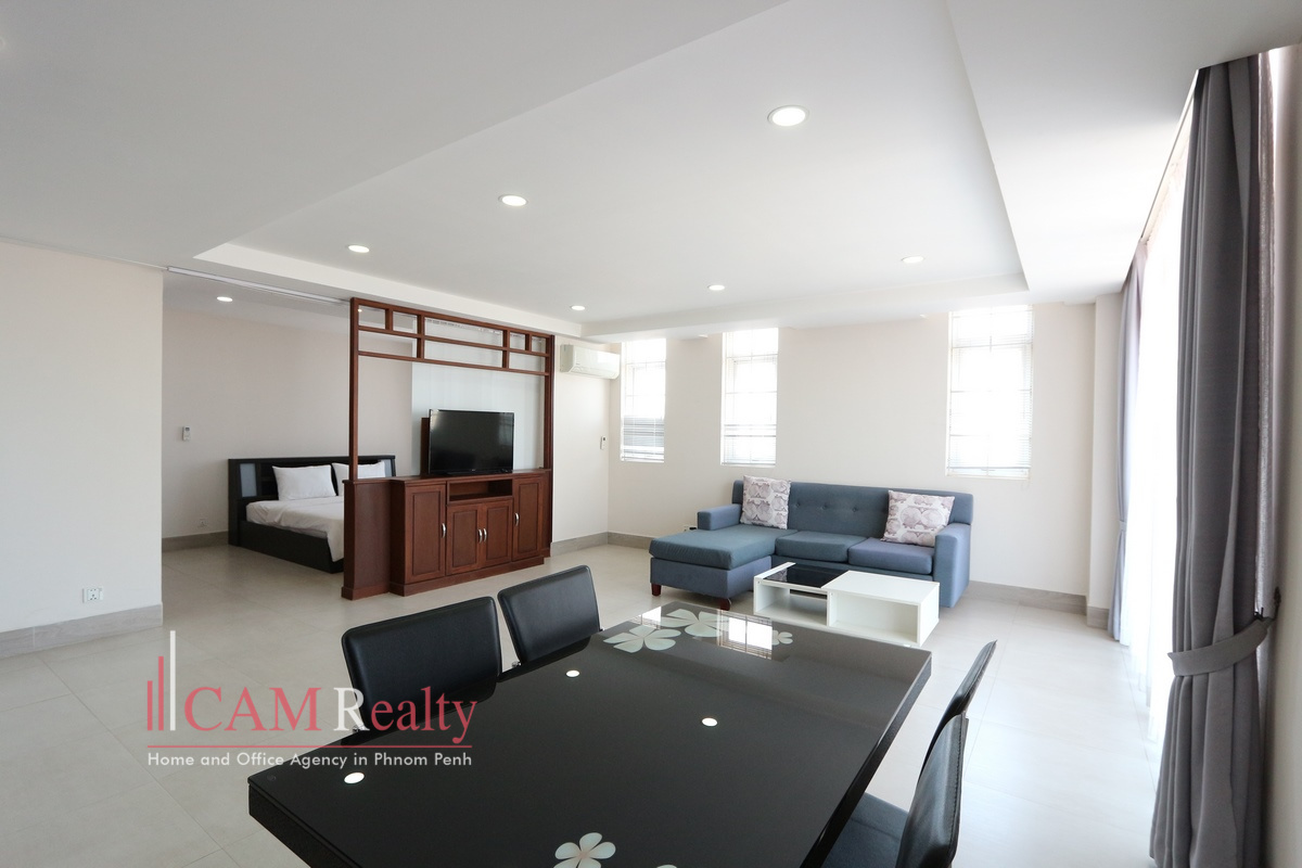 Toul Sleng area (BKK2)|Western style studio serviced apartment for rent. It locates around 200 meters south of Olympic Stadium. It just 8 minutes by walking from BKK1 area. The apartment comes with very nice bedroom, spacious living room and a nice private balcony.