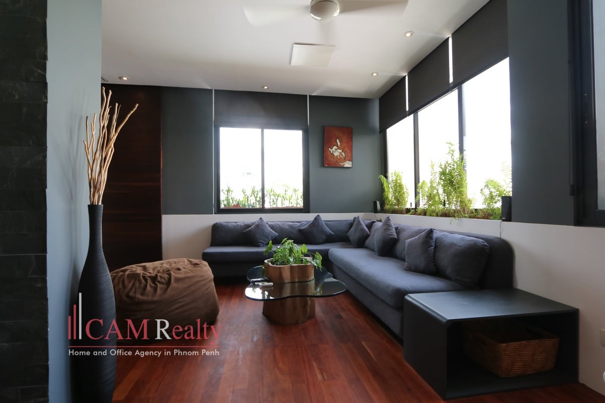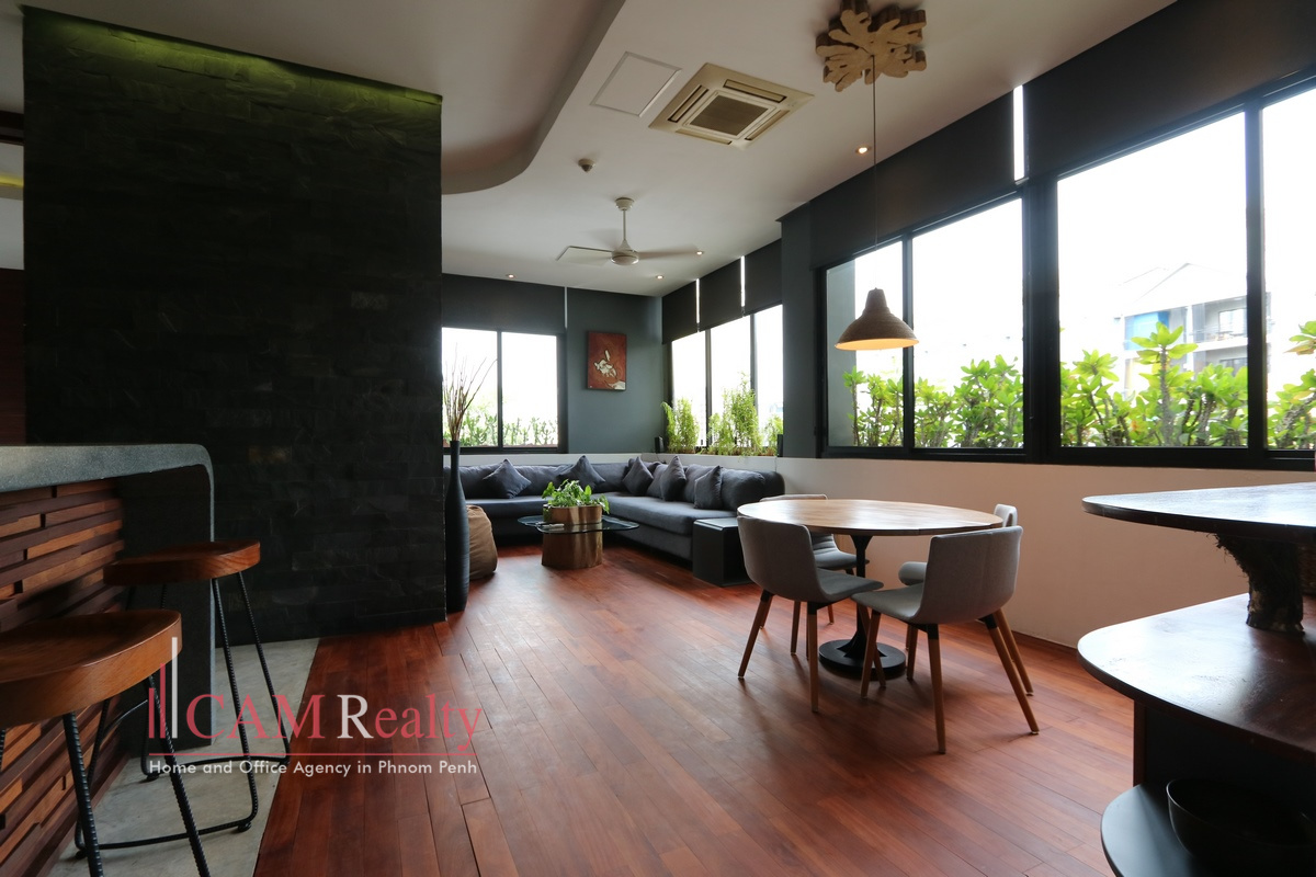 Contemporary 1 bedroom fully serviced apartment for rent in Tonle Basak area – Phnom Penh. This 1 bedroom apartment design embraces Cambodian and Western architecture to details and the unit offers abundance of natural light and city view. It is 5 minutes walking from AEON Mall Phnom Penh/ BKK1 area and 10 minutes from Diamond Island (Koh Pich). Its rental rate is inclusive of services to accommodate tenants to the fullest satisfaction.
