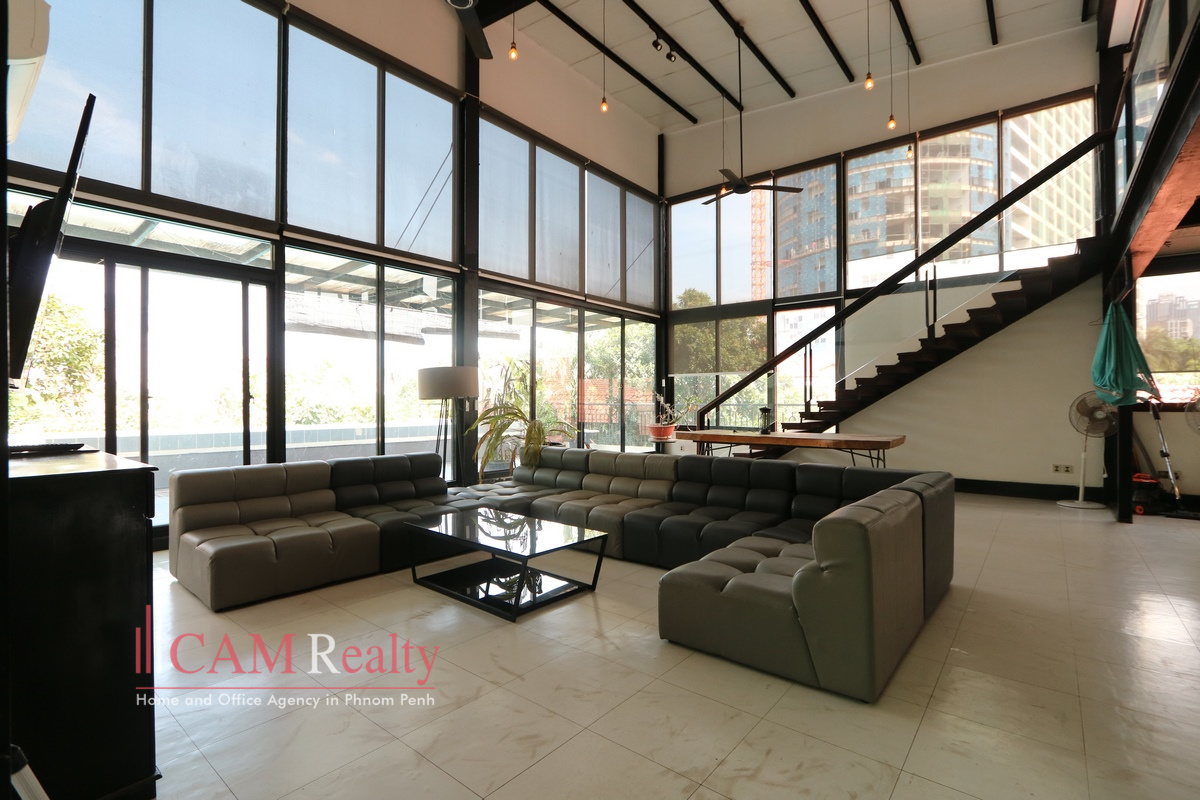 Western and spacious 2 bedrooms apartment for rent in Daun Penh – Phnom Penh. This apartment measures around 300 square meters and offers a private pool, security guard, motor parking, internet(wi-fi), and TV cable. This apartment comes with 2 stories, on the ground floor, consisting of a spacious living room with a completely large sofa, fitted kitchen with oven, washer, American fridge, snooker board and the private pool on the balcony, plus 1 bedroom (en-suit bathroom). On the mezzanine floor, comes with a bedroom(en-suite bathroom with bathtub) plus study room access to a private terrace.